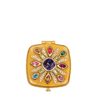 The Schuyler Maltese Compact is the quintessential Hollywood glamour accessory! How chic to hold this golden enameled compact with its jeweled Maltese hand-set with dazzling multi color crystals. Gently push the jeweled button closure and reveal two mirrors to make sure you always look gorgeous.