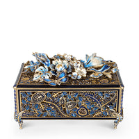 A profusion of tulips, irises, and peonies adorn the Genevieve Grand Floral Chest. A celebration of craftsmanship, this design began in our New York studio by carving each of the thirty flowers blooming on the lid. A delicate lace pattern of leaves forms the sides of the box. In total, twenty separate metal castings are soldered together to form the piece. Finished in antiqued, hand-rubbed brass, with delicately applied enamels; each box is the result of many talented artisans in our New York workshop working for weeks. In the final stage, more than 1,600 Swarovski® crystals in delft garden shades are individually hand-set.