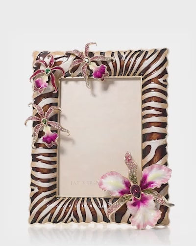Elevate your décor with the luxurious Lana Zebra Orchid 5"x7" Frame - Safari by Jay Strongwater, a captivating blend of exotic pattern and floral beauty. This striking frame features a hand-painted zebra stripe enamel finish, detailed with a gently undulating border that surrounds your photo. Lavish, dimensional orchid blossoms adorn the frame, embellished with sparkling, hand-set crystals and rich enamel, transforming your cherished photograph into a piece of art. Crafted from 14K gold-finished cast pewter, this heirloom-quality frame makes a truly unique and extravagant statement.