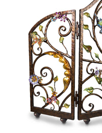Vincente The Vincente Fireplace Screen is only available by special order. To place an order for the Vincente Fireplace Screen please contact our customer service team directly (1-800-640-0546) or send us a message. The Vincente Flora & Fauna Fireplace Screen began at a specialized foundry in Asia where iron rods are hammered, curled, and soldered to form the three panels with their elaborate scrolled interiors. In Rhode Island, individual orchid, peony, tulip, and butterflies are casted in pewter and finished in 14K gold. The Jay Strongwater artisans in Rhode Island paint the garden palette of enamels on each piece, accented with an amazing seventy-five hundred Swarovski® crystals. Our finest artisans bring all the elements together to make each fireplace screen. For decorative use, only.
