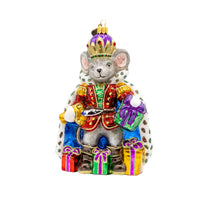 The Mouse King ornament exudes regal charm, draped in a majestic royal cloak and holding a collection of carefully wrapped gifts. Hand-painted with exquisite enamel detail, this elegant figure embodies festive grandeur and timeless holiday spirit.