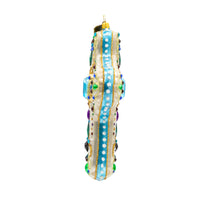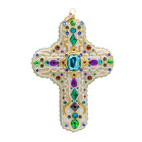 This exquisite cross ornament is adorned with an array of peacock-inspired jewels, shimmering in rich blues, greens, and purples, accented with subtle hints of ruby red. A harmonious blend of color and brilliance, it embodies both reverence and refined elegance for the season.