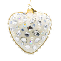 This exquisite heart ornament shimmers in timeless elegance, adorned with hand-set stones that evoke the brilliance of diamonds. Featuring a radiant mix of round, marquise, and teardrop cuts, each jewel sparkles against a luminous white backdrop and is framed in gleaming gold trim.