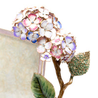 Graceful and romantic, the 5" x 7" Pink Hydrangea Frame captures the soft beauty of blooming florals with extraordinary detail and craftsmanship. Sculpted in pewter and finished in 14K gold, this elegant frame is adorned with sculptural hydrangeas, each petal hand-enameled in 11 delicate shades including Sheer Lilac, Mauve Ore, and English Lavender.