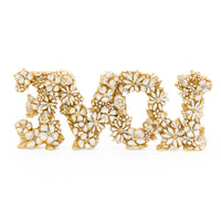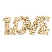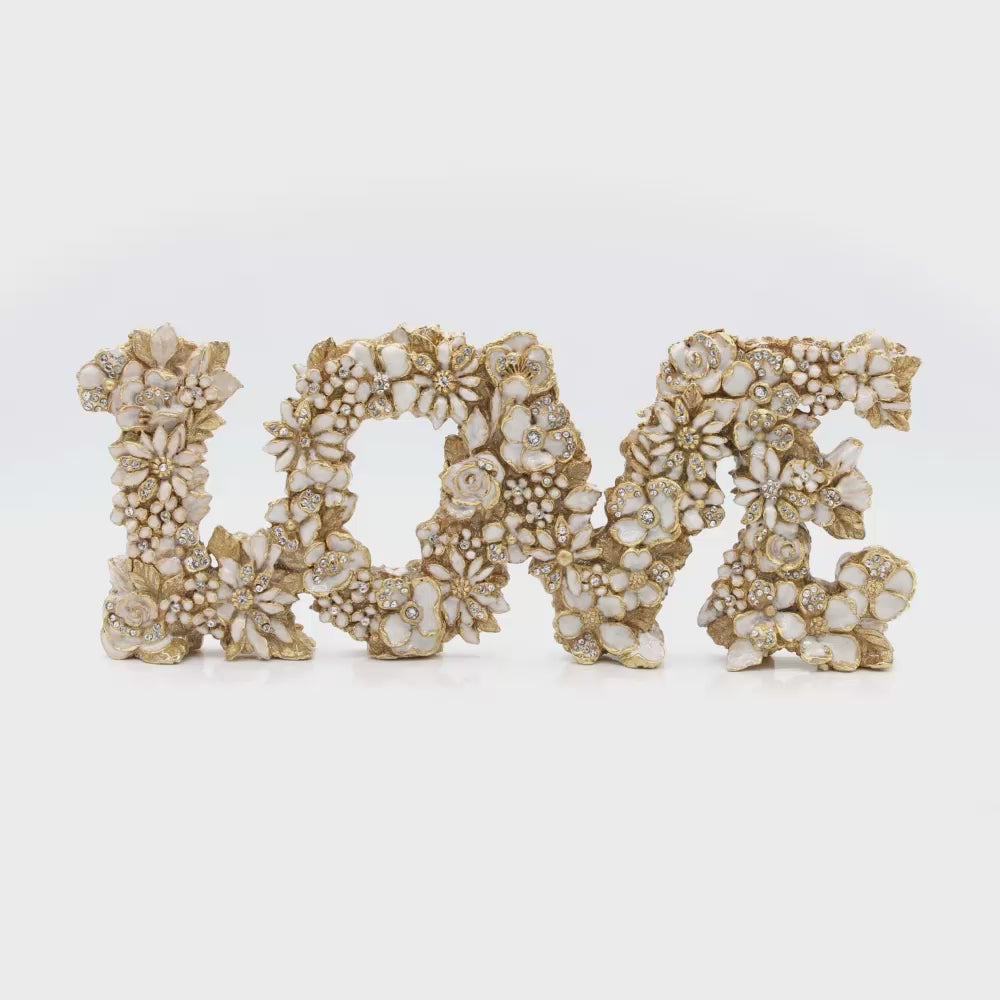 Introducing our new Opal Love Objet, a stunning expression of romance and craftsmanship. Hand-carved flowers elegantly spell out 'LOVE,' crafted from zinc with luxurious 14kt gold plating. Lightly brushed with opal enamel to let the gold shine through, it's further embellished with 300 hand-placed European crystals for a radiant sparkle.