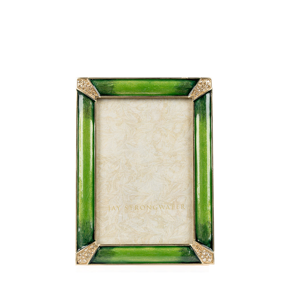 Introducing the Lavinia Frame in Emerald Green, a classic spin on modern luxury. This 4x6 frame embodies timeless elegance, with each detail hand-enameled for a rich depth that captivates the eye. Adorned with opulent European crystals and crafted from premium materials including durable zinc and plated in 14K gold, this frame is not just a showcase for your memories but a symbol of refined taste. Our signature enamel back plate makes this a masterpiece from every angle. The emerald green color adds a touch of sophistication and versatility to any home decor. Metal back plate and kickstand, the frame is truly beautiful from any view, stands horizontally and vertically