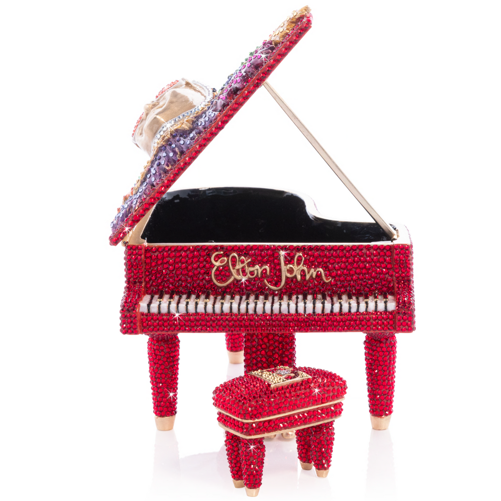 Capture the unique panache of the one and only Elton John with this intricately crafted Rock Box. Set with over six thousand individual Swarovski® crystals, hand-enameled and finished in gleaming 14K gold, this brilliantly designed box encapsulates the flair of Elton’s glittering headpiece and glasses. Let it radiate magic and beauty throughout your home.