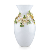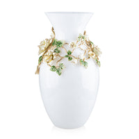 Introducing the Gabrielle Rose Grand Vase, a stunning 19.5-inch masterpiece blending timeless craftsmanship with elegant design. The clear glass vase, mouth-blown in Poland, features delicate white accents that create a luminous, ethereal effect. Its pewter rose collar, crafted from 18 individually cast elements soldered together, showcases vibrant yellow roses brought to life with eight hand-applied enamel shades. Adorned with over 375 hand-placed European crystals, this breathtaking vase is a radiant statement piece for any space.