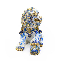 This stunning Foo Dog statue is hand-enameled in eight shades of cream and blue, showcasing remarkable artistry and depth. Adorned with over 690 European crystals and featuring a freehand-painted floral design. It takes over 15 hours to make just one of these statues.
